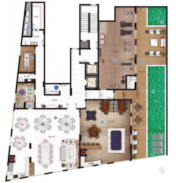 - Piso em porcelanato no living, sacada, cozinha, área de serviço, banheiros e lavabo;